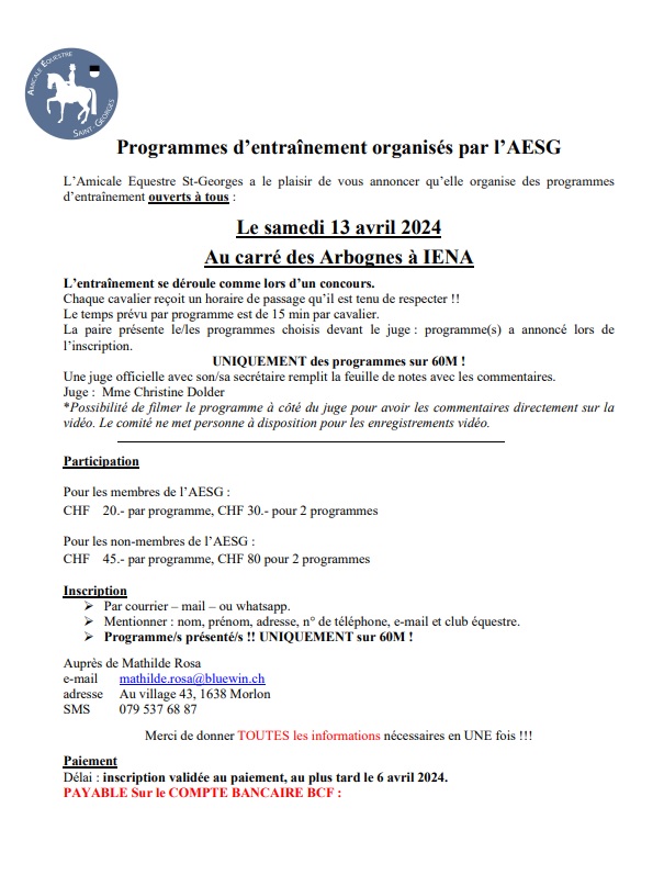 Entraînements de dressage avec Christine Dolder 24 mars 202425 avril 2024 amicalestgeorges samedi 13 avril au carré de dressage de l’Arbogne à IENA entrainements-programmes-13-avrilTélécharger Partager : Cliquer pour partager sur X(ouvre dans une nouvelle fenêtre) X Cliquez pour partager sur Facebook(ouvre dans une nouvelle fenêtre) Facebook