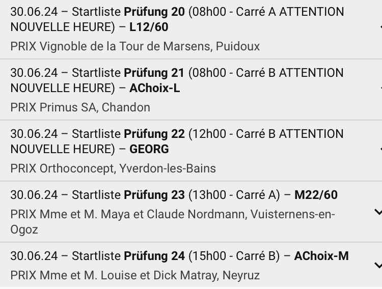 Dimanche 30 juin, début des épreuves à 8.00 (au lieu de 7.00). Toutes les infos sur les listes de départ sur http://info.swiss-equestrian.ch/#/startlisten/55674