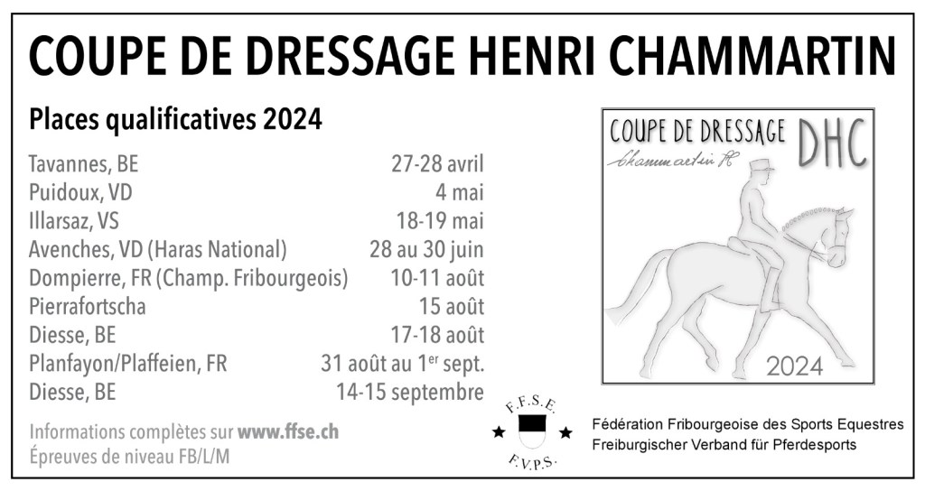 Cette année encore, la coupe Chammartin sera reconduite sous la houlette de Natalie Willemin, responsable du dressage fribourgeois et avec le soutien de nos généreux et fidèles sponsors.